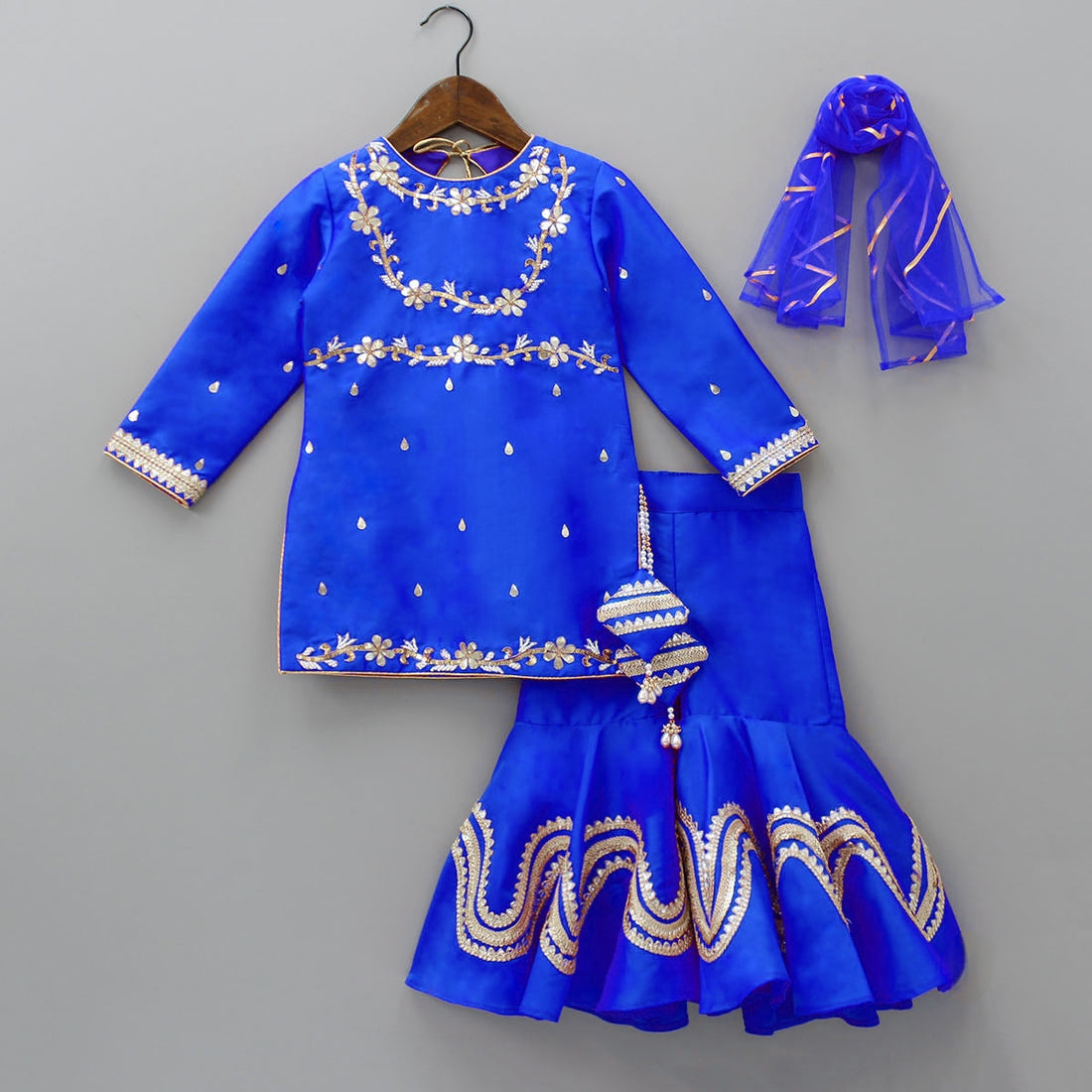 Pre Order: Gota Work Elegant Blue Kurti And Sharara With Net Dupatta
