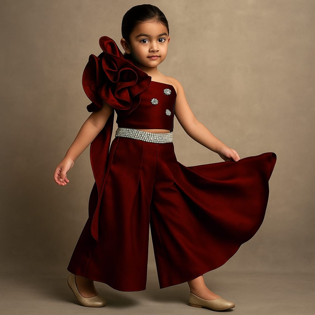 Pre Order: Brick Swirled Flower Embellished One Shoulder Top And Flared Palazzo