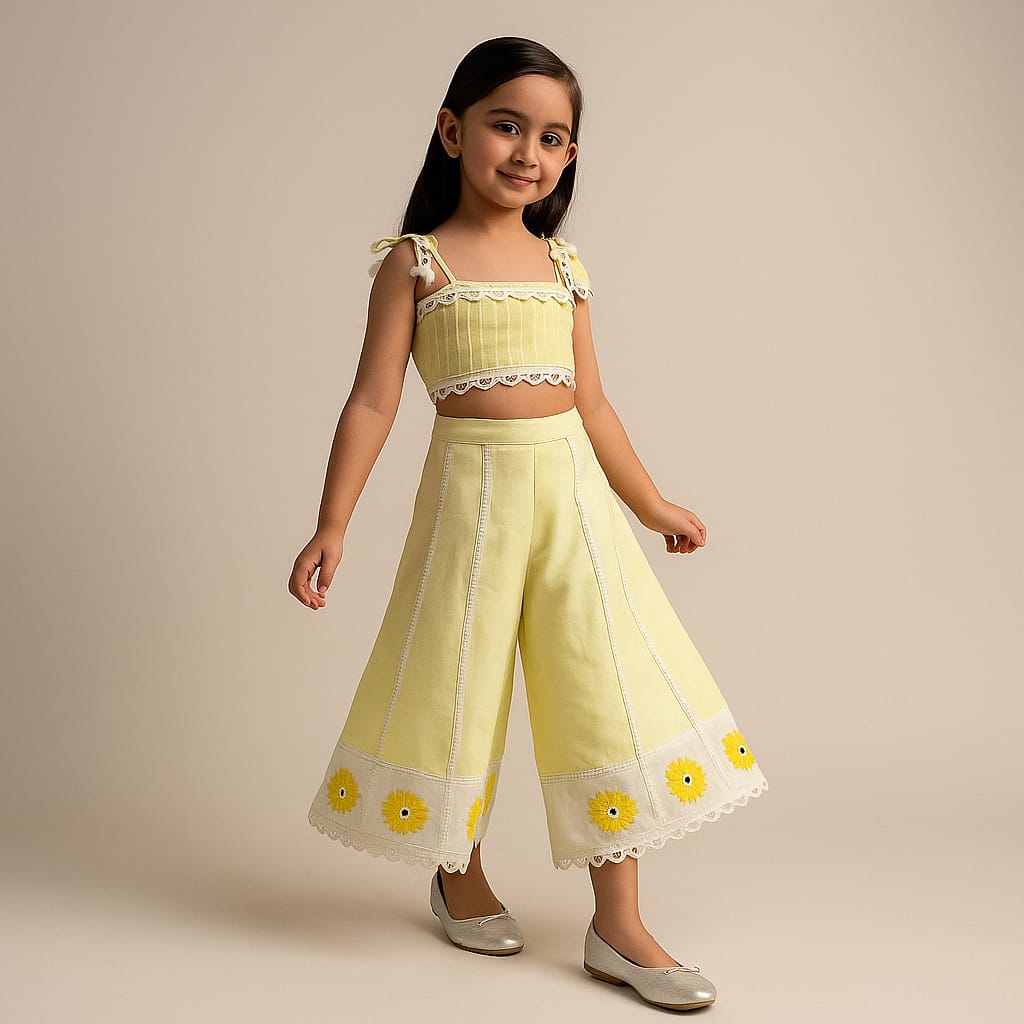 Pre Order: Yellow Strappy Embellished Top And Flared Palazzo