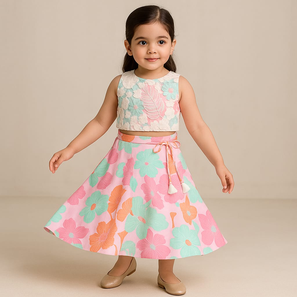 Pre Order: Floral Embroidered Printed Multicolour Scalloped Top And Fringes Tassels Enhanced Palazzo