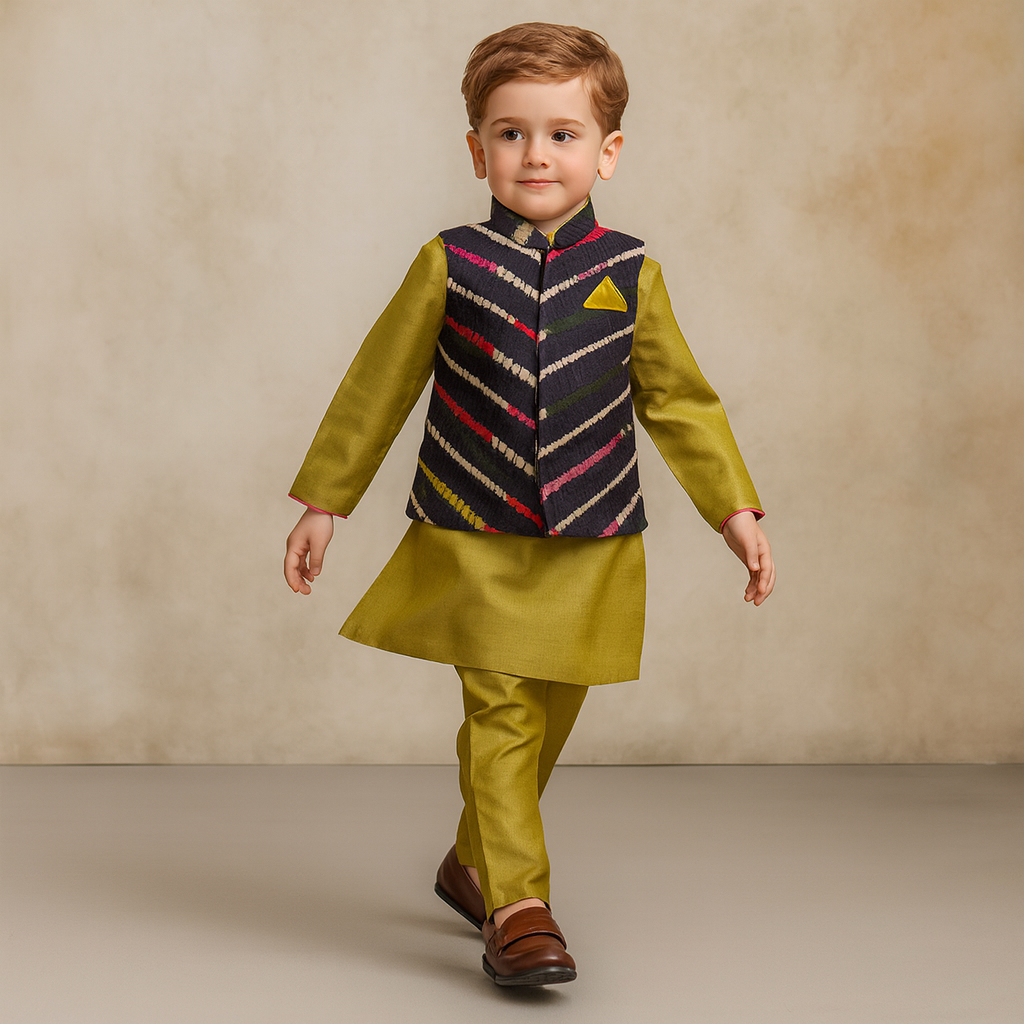 Pre Order: Green Kurta With Printed Multicolour Jacket And Pyjama