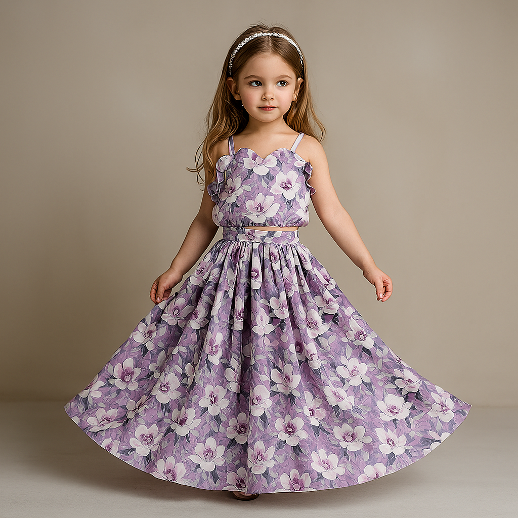 Lavender Printed Goti Work Top And Lehenga