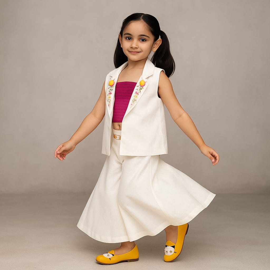 Pink Spaghetti Top With Coat Style Jacket And Palazzo With Sequin Embroidered Belt